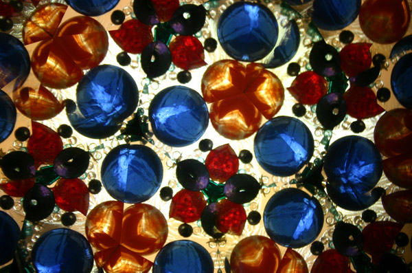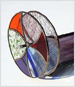 The heart of a kaleidoscope is a tube of mirror, down which you look at an object. There are many mirror systems possible but I prefer a simple triangular tube, sometimes straight and sometimes a tapered tube. The object at the end is entirely made of glass, either discs that rotate which give a gentle silent experience, or a box end filled with various beads, sequins etc, which is turned so that the contents tumble and fall giving a suddenly changing endless variety of images.